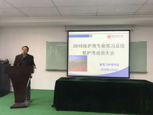 3月9日下午,康复与护理学院在综合楼204召开2015级护理专业实习总结暨护考动员大会。学院院长蒋伏心教授,康护学院院长孙国庆,副院长王友顺、顾小花,护理系主任胡晓燕、副主任王侃,相关教师、辅导员教师以及2015级护理专业全体学生参加大会。会议由顾小花副院长主持,分两阶段进行。